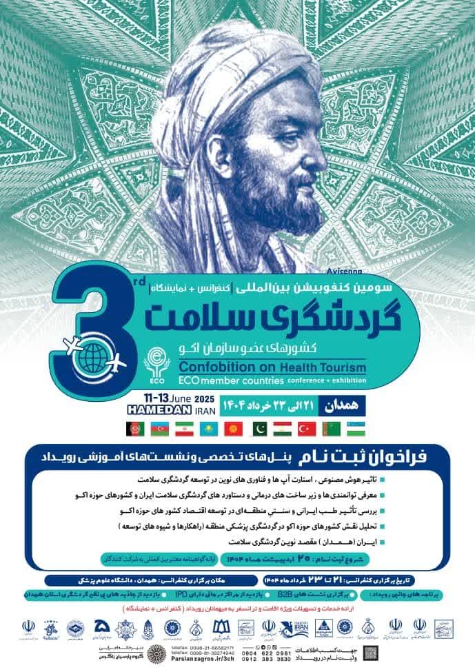به اطلاع می رساند استان همدان از تاریخ ۲۱ لغایت ۲۴ خردادماه میزبان سومین کنفوبیشن (کنفرانس + نمایشگاه) بین المللی گردشگری سلامت کشورهای عضو سازمان اکو می باشد و از هر کشور عضو اکو، هیئتی مشتمل بر عالی ترین مقامات درمان و سلامت + گردشگری، فعالان بلند پایه پزشکی و گردشگری، مدیران تشکل های گردشگری و درمان و گروههای بخش خصوصی تجاری و اقتصادی و همچنین سفیر هر کشور مستقر در تهران همراه با رایزن اقتصادی سفارت، میزبان این رویداد می باشند. برگزاری با شکوه و حضور پرشور مجموعه های فعال در حوزه های متنوع گردشگری سلامت سراسر کشور در این رویداد بین المللی، ضمن معرفی ظرفیت ها و توانمندی های تخصصی حوزه های گردشگری سلامت و تندرستی همه استان های کشور، زمینه تبادلات تجاری و اقتصادی اعم از صادرات، جذب سرمایه گذاری و ارز آوری خواهد بود.