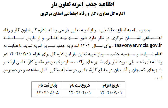 اطلاعیه جذب امریه تعاون یار ۱۱ تیر ۱۴۰۴ | ۱۲:۰۴ کد : ۵۲۷۴۸ اطلاعیه ارسال به دیگران نام شما ایمیل شما ایمیل دریافتکننده ارسال انصراف تعداد بازدید:۱۰۷۴ اطلاعیه جذب امریه تعاون یار