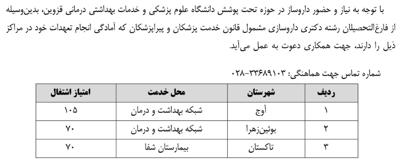 جذب نیروی داروساز مشمول قانون خدمت ۲۵ آذر ۱۴۰۴ | ۰۹:۰۰ کد : ۵۷۰۵۷ اطلاعیه ارسال به دیگران نام شما ایمیل شما ایمیل دریافتکننده ارسال انصراف تعداد بازدید:۴۹۱ جذب نیروی داروساز مشمول قانون خدمت در دانشگاه علوم پزشکی قزوین